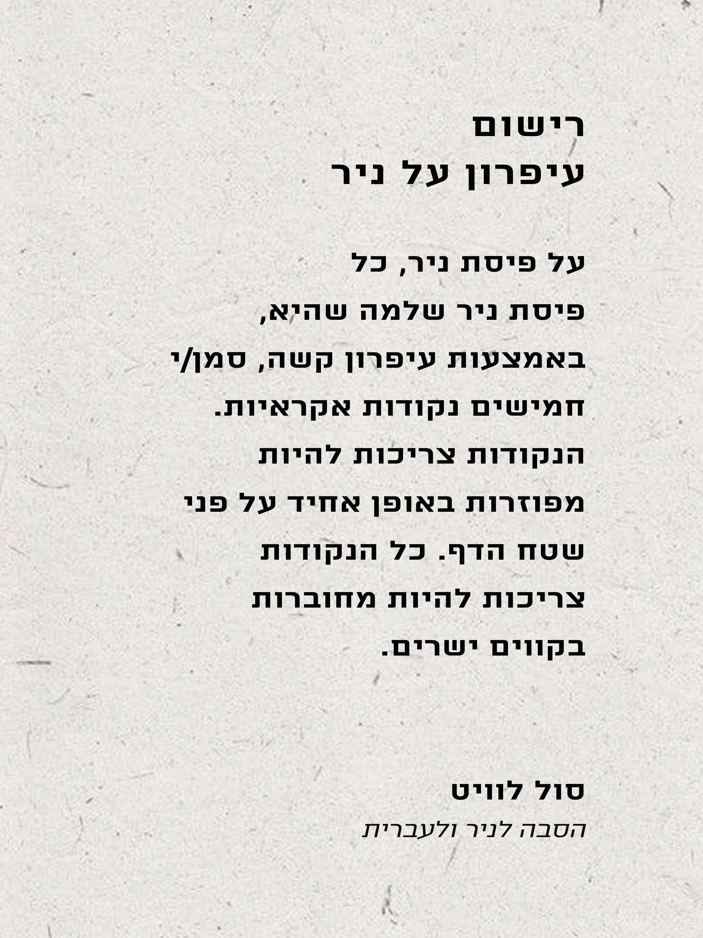 בשנות הששים של המאה הקודמת החל האמן האמריקאי סול לוויט (Sol Lewitt) ליצור את ציורי הקיר הידועים שלו: טקסטים קצרים של הנחיות שנועדו למימוש על גבי קיר על ידי רַשמים שהוכשרו לכך במיוחד. כשישים שנה מאוחר יותר, באמצע שנת 2019, 13 אמניות ואמנים ישראלים מקבלים על עצמם כל אחד לבצע את ההוראות המקוריות לציור קיר מספר 118 של לוויט, בשני שינויים קלים: במקום על קיר, ברישום קטן מימדים בעיפרון על ניר ובנוסף לכתוב טקסט חופשי קצר על העבודה.